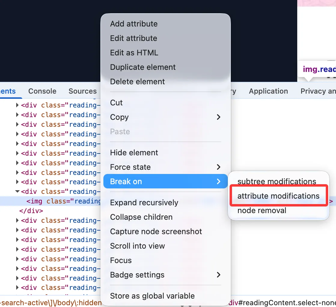 上图中我们可以看到,该网站的图片是做了懒加载的。视口外的 img 元素并没有 src 属性。那么就很简单了,我们可以通过 Devtool 对该图片加上 DOM 断点,触发后看 call stack。